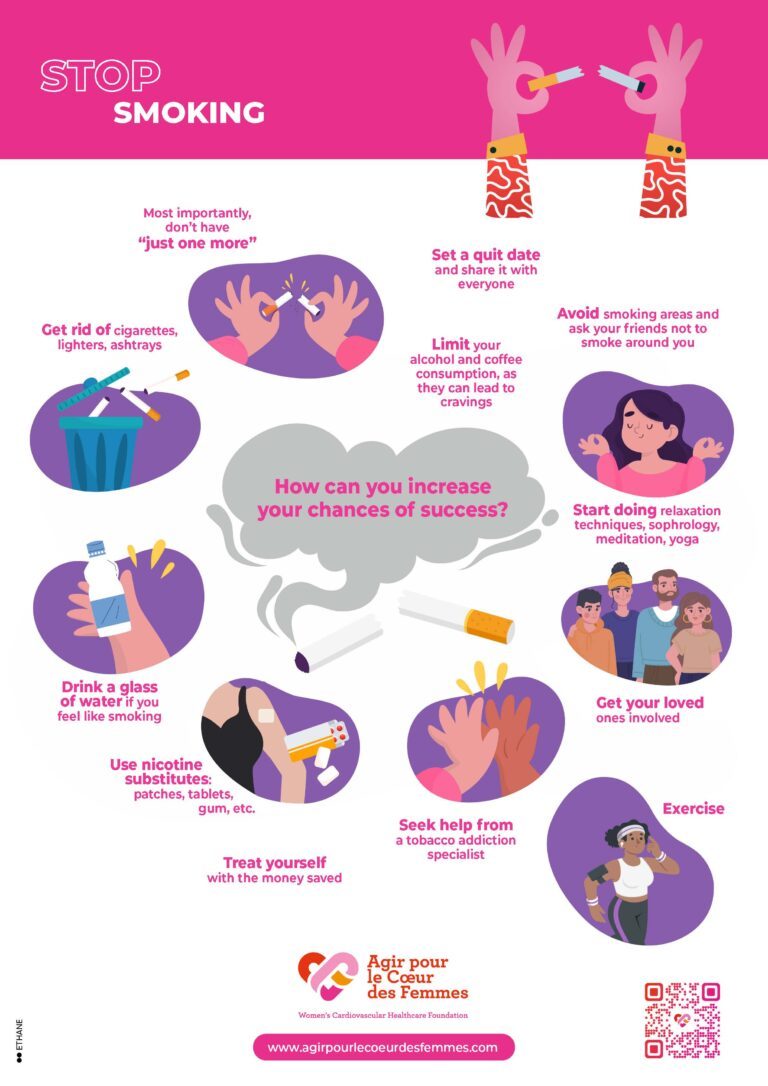 Tobacco is one of your heart’s worst enemies. Quitting smoking can be beneficial at any age; after five years smoke-free, your risk of getting a heart attack reaches a level comparable to that of someone who has never smoked. Although quitting smoking is a true challenge, you can increase your chances of success through a few simple actions.