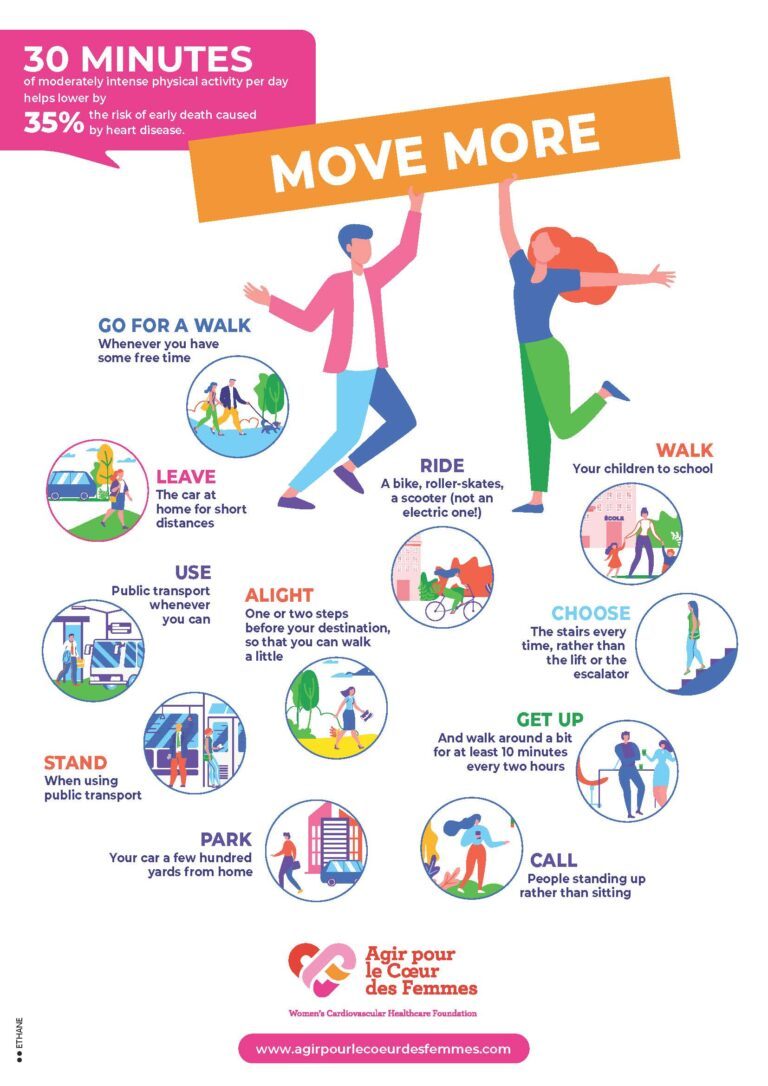 Moderate-intensity physical activity for at least 30 minutes, five times a week, considerably reduces the risk of cardiovascular disease. To do so, there’s no need to turn your daily routine upside down: simple habits can make all the difference.