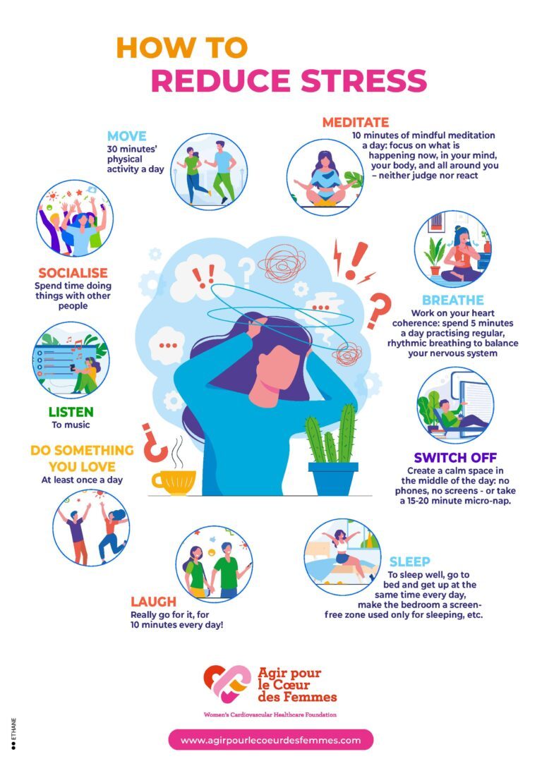 At least 30 minutes of physical activity a day will help reduce its effects on the body. A good night’s sleep, perhaps supplemented by a short nap (15-20 minutes), can contribute to your general well-being. Choosing the people you spend time with wisely, keeping a healthy social life, laughing every day and allowing yourself moments of pleasure are all effective ways of relieving pressure.